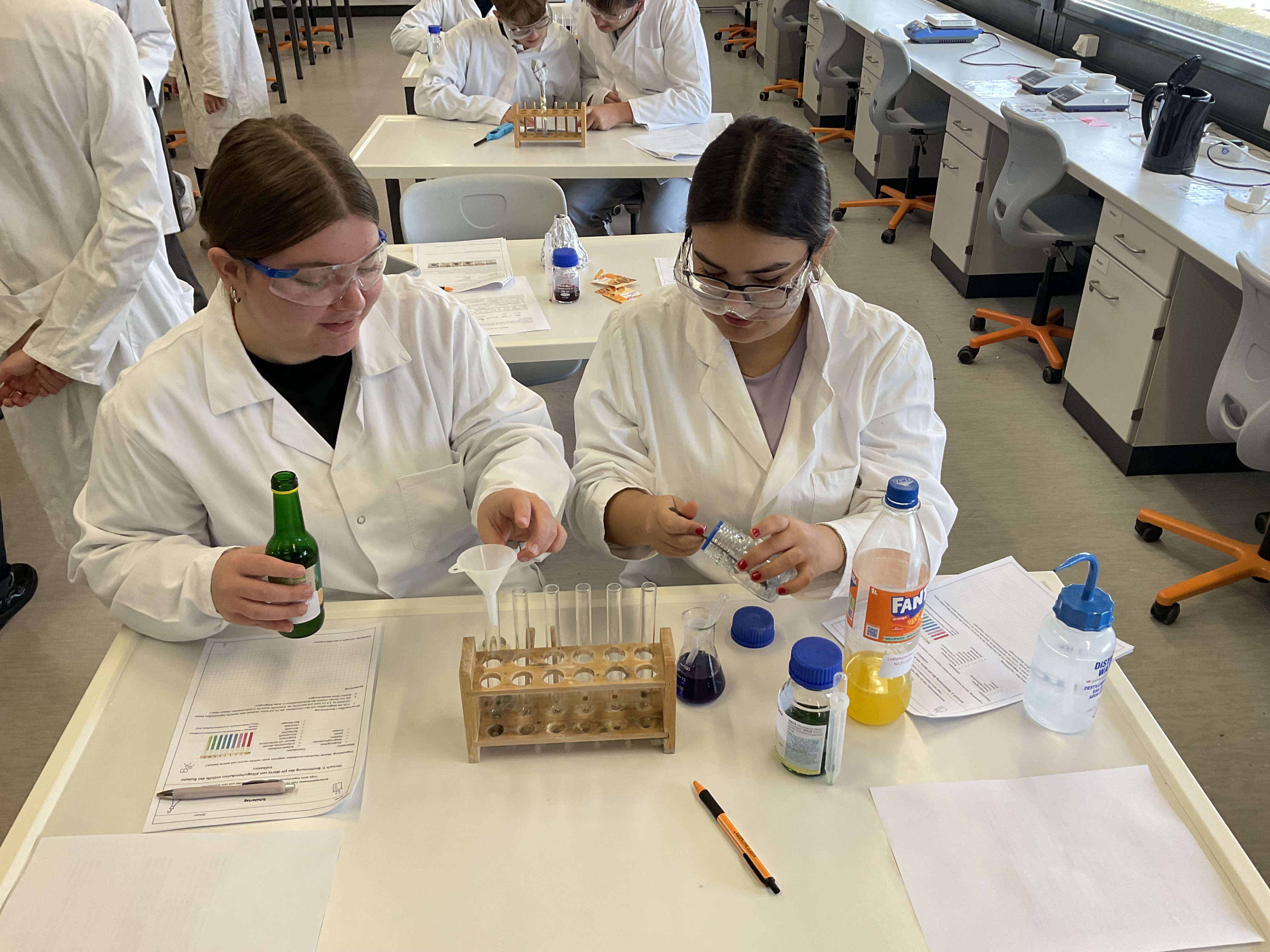 Aufgeteilt in Kleingruppen ging es daran, den pH-Wert genauer unter die Lupe zu nehmen, sowie interessante Versuche zum Thema Natriumschiffchen und WC-Reiniger oder Essigsäurevulkane durchzuführen.