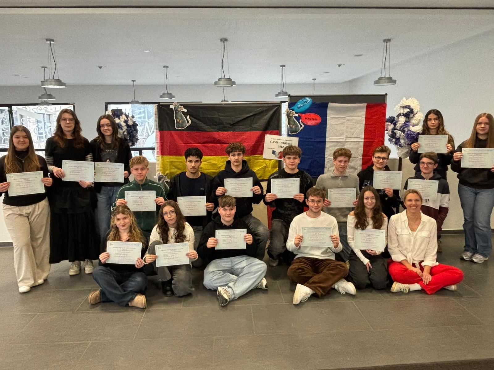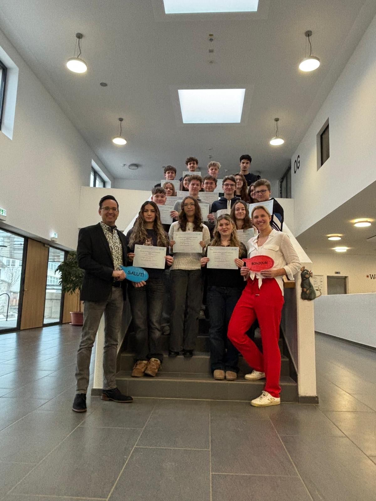 Weiterhin wurde dieser Tag zum Anlass genommen, unseren Zehntklässlern ihr im vergangenen Schuljahr erworbenes DELF- Diplom der Niveaustufe A2 feierlich zu überreichen. Dieses Diplom ist ein anerkanntes Sprachzertifikat, dass bei Berufsausbildung und Studium im In- und Ausland anerkannt wird. Mit erfolgreich absolvierter Abschlussprüfung im Juli 2026 werden unsere Zehntklässler dann die Niveaustufe B1 erreicht haben und können in ihr Berufs- oder FOS-Leben starten.