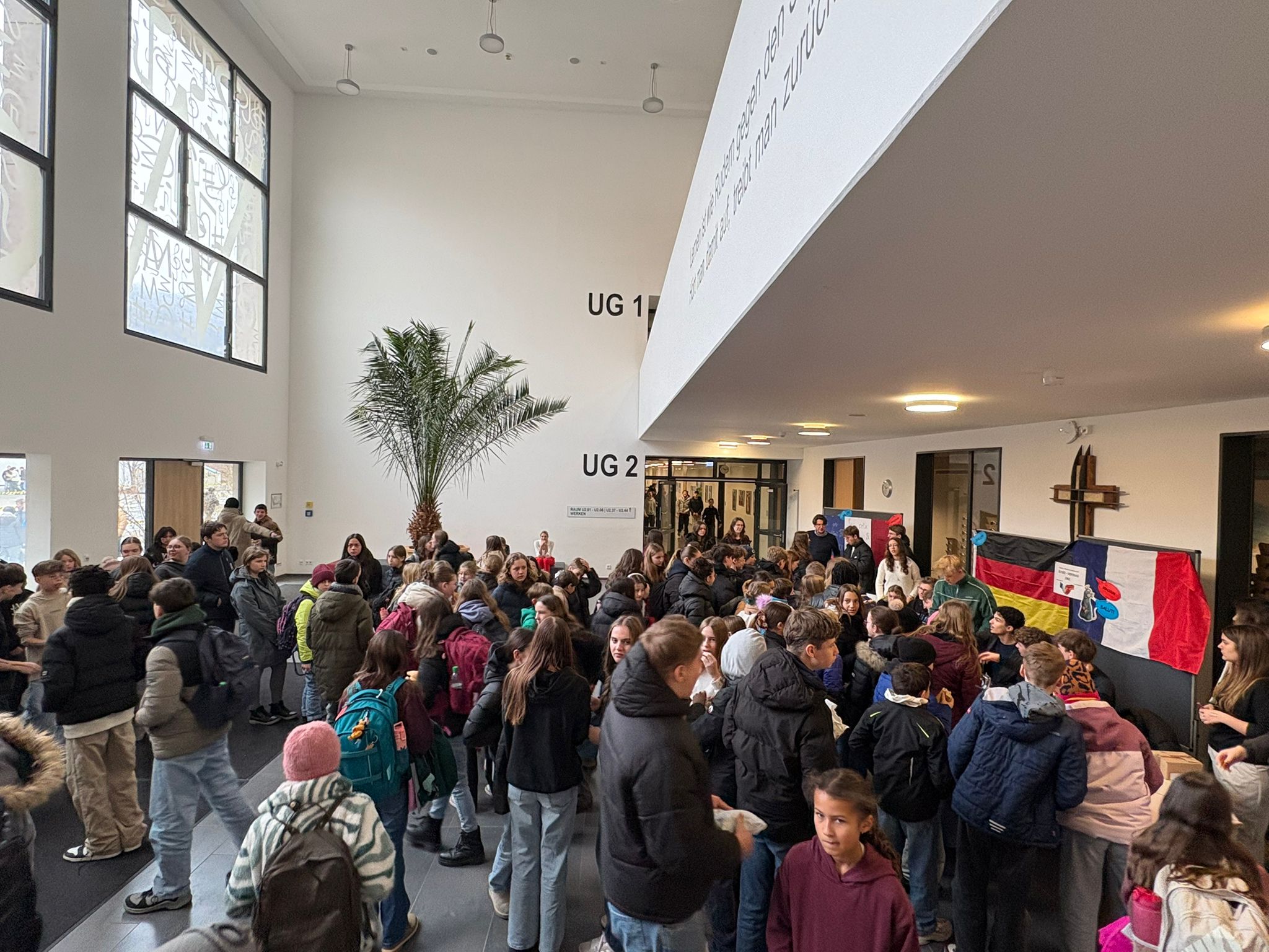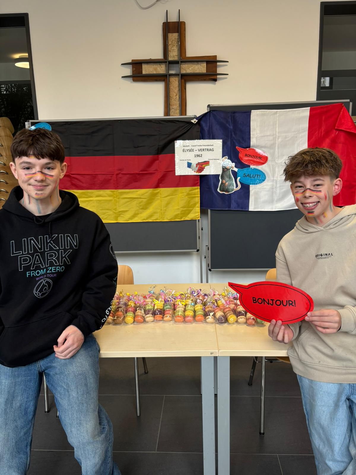 Anlässlich dieses besonderen Tages wurde auch in diesem Schuljahr der Eingangsbereich unserer Schule in den französischen Landesfarben festlich geschmückt. Die Französischschüler der zehnten Klassen verkauften in der Pause leckere Schokoladencroissants und bunte Macarons an ihre Mitschüler.